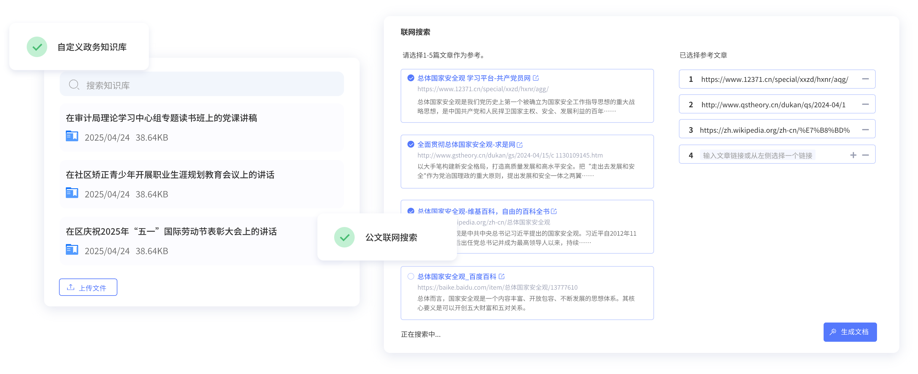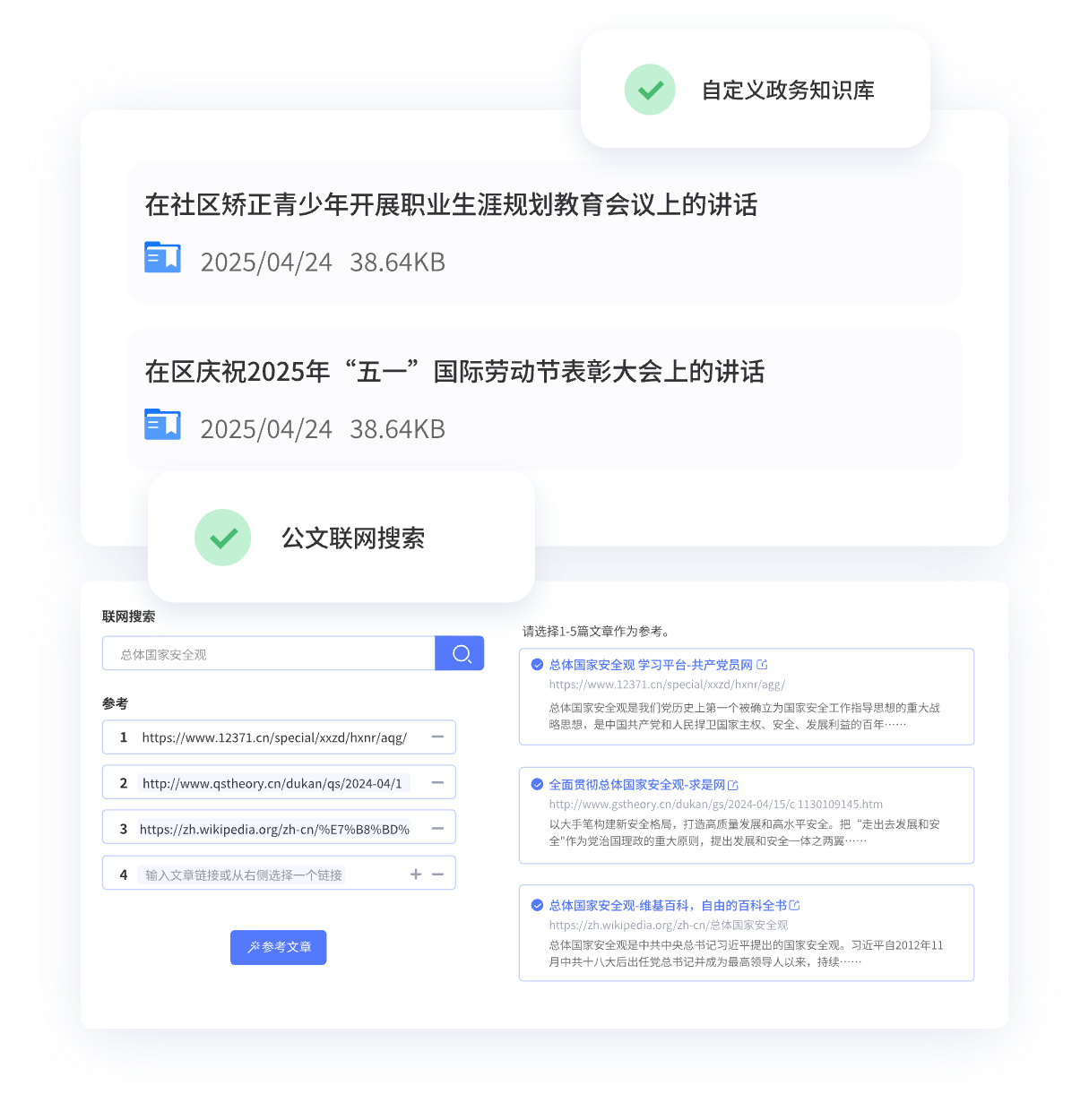 上傳政務(wù)或個人寫作常用材料,用于精準生成符合自己寫作風(fēng)格的公文